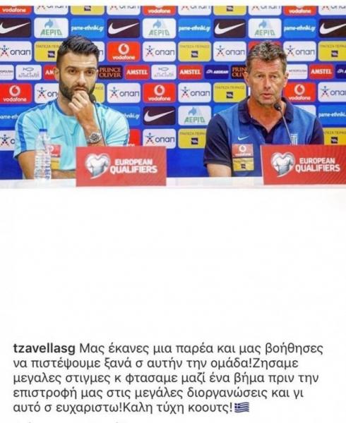 «Μας έκανες μια παρέα και μας βοήθησες να πιστέψουμε ξανά σ αυτήν την ομάδα! Ζήσαμε μεγάλες στιγμές και φτάσαμε μαζί ένα βήμα πριν την επιστροφή μας στις μεγάλες διοργανώσεις και γι αυτό σ΄ ευχαριστώ! Καλή τύχη κόουτς!» έγραψε στο Instagram ο Τζαβέλλας για τον απερχόμενο κόουτς της Εθνικής.