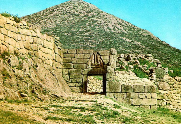 Η Πύλη των Λεόντων, η κύρια είσοδος της τειχισμένης ακρόπολης και ιδιαίτερα αξιόλογο δείγμα μνημειακής γλυπτικής, που οφείλει την ονομασία της στο ανάγλυφο σύμπλεγμα αντικριστών λεόντων που καλύπτει το τρίγωνο πάνω από το υπέρθυρο.