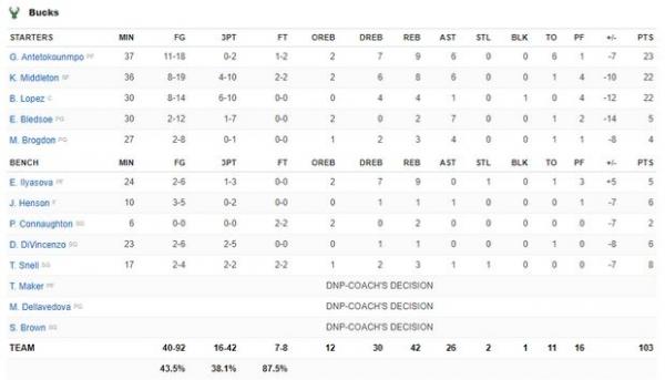Το πρόσημο ήταν ξανά θετικό για τον Γιάννη Αντετοκούνμπο, αλλά η εμφάνισή του (23 πόντοι με 11/18 σουτ, 9 ριμπάουντ και 6 ασίστ) δεν αρκούσε για να αποφευχθεί η δεύτερη ήττα της ομάδας του. Οι Μπακς έχουν πλέον επίδοση 8-2 στο NBA και βρίσκονται στη δεύτερη θέση της Ανατολής πίσω από τους Ράπτορς (10-1).