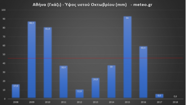 Στην Αθήνα έπεσαν φέτος τον Οκτώβριο μόλις 0,6 χιλιοστά βροχής, έναντι 6,6 χιλιοστών τον Οκτώβριο του 2017, ενώ το ρεκόρ της τελευταίας δεκαετίας κατέχει ο πολύ βροχερός Οκτώβριος του 2015 με 94 χιλιοστά βροχής. «Μουσκεμένοι» υπήρξαν επίσης οι Οκτώβριοι του 2009 (88,3 χιλιοστά), του 2010 (81,8) και του 2016 (60,4).