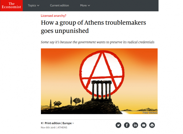 «Αφιέρωμα» στον Ρουβίκωνα κάνει το βρετανικό περιοδικό Economist, επισημαίνοντας μεταξύ άλλων πως πολλοί παρατηρητές πιστεύουν ότι η κυβέρνηση του Αλέξη Τσίπρα δείχνει ανοχή στις δραστηριότητες του Ρουβίκωνα, ελπίζοντας να καθησυχάσει τους αριστερούς ψηφοφόρους.