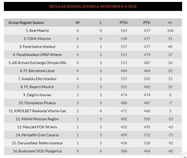 Πώς διαμορφώθηκαν οι βαθμολογικοί συσχετισμοί, μετά την 6η αγωνιστική της Euroleague
