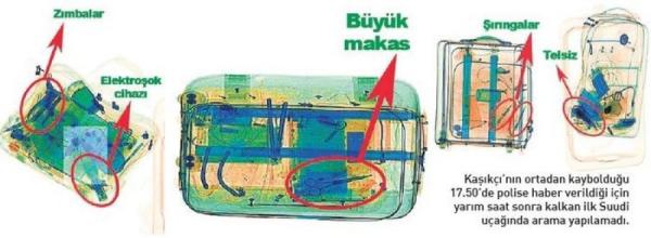 Οι φωτογραφίες που προέρχονται από τις συσκευές ακτίνων Χ στο αεροδρόμιο της Κωνσταντινούπολης φαίνεται ότι λήφθηκαν όταν οι Σαουδάραβες δολοφόνοι πέρασαν από τους ελέγχους ασφαλείας του αεροδρομίου κατά την αναχώρησή τους για το Ριάντ.