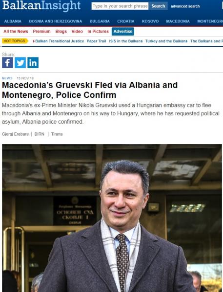 Με ουγγρική βοήθεια, μέσω της Αλβανίας και Μαυροβουνίου, φαίνεται πως έφτασε στην Βουδαπέστη ο καταζητούμενος πρώην πρωθυπουργός της ΠΓΔΜ, Νίκολα Γκρουέφσκι, ο οποίος έχει ζητήσει άσυλο στην Ουγγαρία, όπως αναφέρει το πρακτορείου ειδήσεων, Balkan Insight