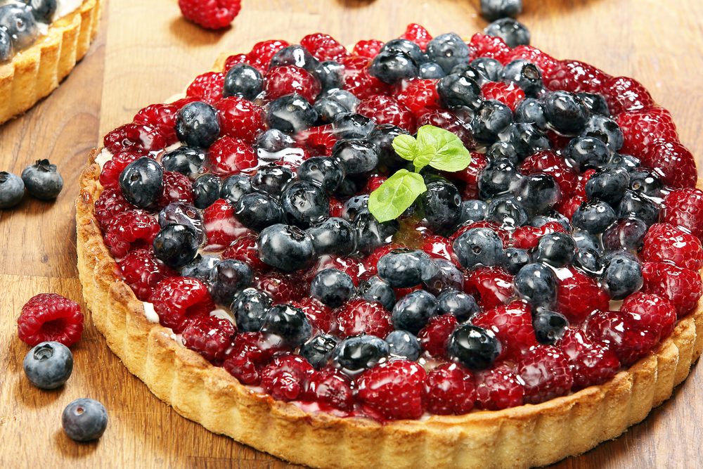 5. Στο μεταξύ ετοιμάζετε τη γέμιση. Βάζετε τα κατεψυγμένα φρούτα σε ένα κατσαρολάκι μαζί με τη ζάχαρη και τα βράζετε σε σιγανή φωτιά για 10-12΄ μέχρι να πήξουν. Τα αφήνετε να κρυώσουν και αδειάζετε το μείγμα στην τάρτα στρώνοντάς το ομοιόμορφα με μια ξύλινη κουτάλα.