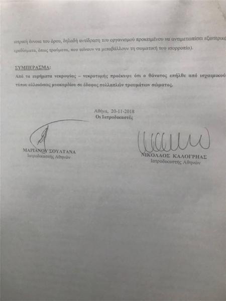 Οι ιατροδικαστές Νίκος Καλογριάς και Σουλτάνα Μαριανού, αφού μελέτησαν τα αποτελέσματα της νεκροτομής, των τοξικολογικών και ιστολογικών εξετάσεων και κατέληξαν στα συμπεράσματά τους για τα αιτία του θανάτου του 33χρονου Ζακ Κωστοπούλου στην οδό Γλάδστωνος στις 21 Σεπτεμβρίου αναφέρουν ότι « ο Ζακ Κωστόπουλος έπαθε ισχαιμικού τύπου αλλοιώσεις μυοκαρδίου από τα πολλαπλά τραύματα στο σώμα του που προκάλεσαν έντονη διέγερση στον οργανισμό του και τον θάνατο του».