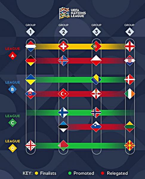 Στην League A του νεοσύστατου Nations League δεν υπάρχει προβιβασμός, αλλά πρόκριση στην τελική φάση. Οπότε Αγγλία, Ολλανδία, Πορτογαλία και Ελβετία, ως πρώτοι των τεσσάρων ομίλων, θα διεκδικήσουν 5-9 Ιουνίου το τρόπαιο, αλλά και το χρηματικό έπαθλο των 7,5 εκατ. ευρώ που προσφέρει η UEFA στο νικητή.