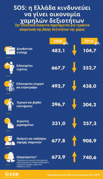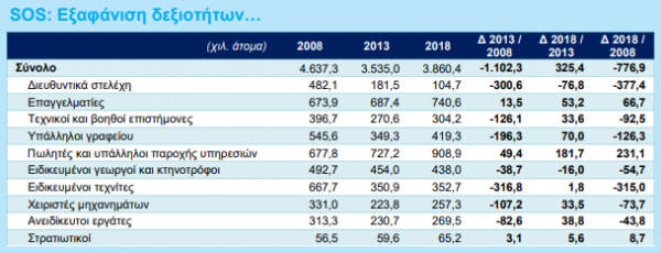 Όπως αναφέρει συγκεκριμένα στο δελτίο, το 2008 υπήρχαν στη χώρα 482 χιλ. διευθυντικά στελέχη, δέκα χρόνια αργότερα έχουν μείνει μόνο 105 χιλ. (κυρίως λόγω απωλειών στο εμπόριο και τον τουρισμό), έχοντας μάλιστα μειωθεί και κατά 77 χιλ. άτομα από το 2013 και μετά. Ενώ το 2008 υπήρχαν 668 χιλ. ειδικευμένοι τεχνίτες, το 2018 έχουν απομείνει μόνο 353 χιλ., έχοντας αυξηθεί μόλις κατά 1,8 χιλ. άτομα από το 2013 και μετά.