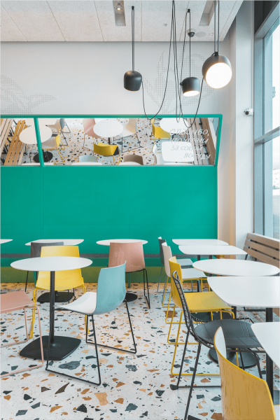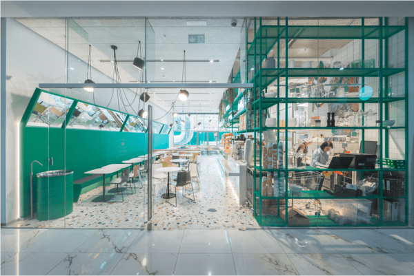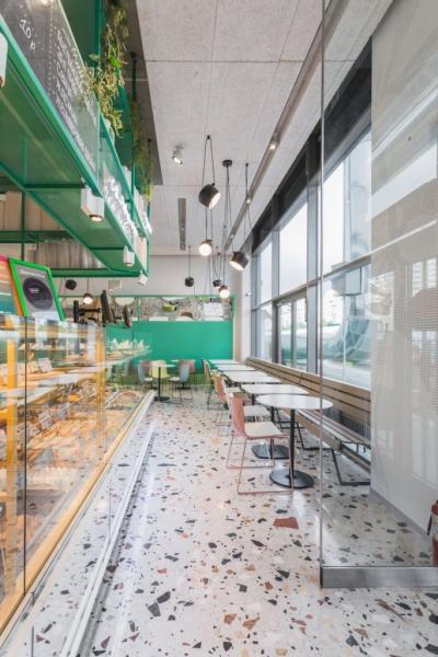 Οι πράσινοι πίνακες με ενσωματωμένα παράθυρα στέκονται στο σκηνικό, διευρύνοντας οπτικά το χώρο. Νέον γράμματα και ακανόνιστα φωτιστικά που κρέμονται από την οροφή προσθέτουν μια βιομηχανική πινελιά στο εστιατόριο.