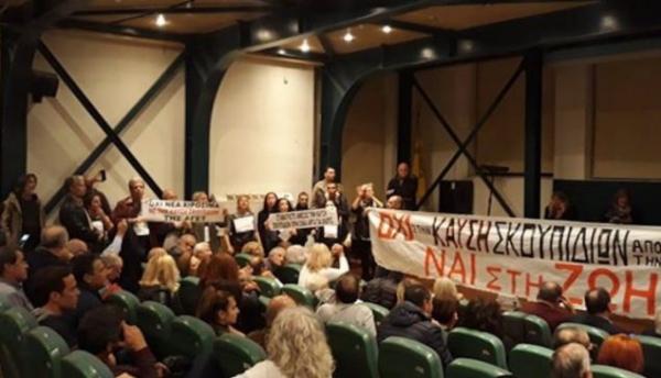 Μέλη της αντίστοιχης Επιτροπής Αγώνα Πολιτών πραγματοποίησαν διαμαρτυρία κατά της καύσης των σκουπιδιών και άνοιξαν πανό μπροστά από το πάνελ των ομιλητών, ενώ φώναζαν και συνθήματα.