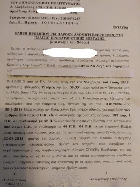 Μετά τον Παναγιώτη Λαφαζάνη και άλλων μελών του κινήματος κατά των πλειστηριασμών και η Αυγή Βουτσινά κλήθηκε σε απολογία από το τμήμα Προστασίας του Κράτους και του Δημοκρατικού Πολιτεύματος