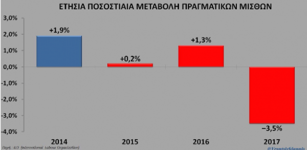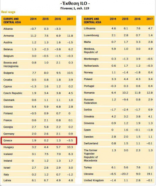 Το 2017 ήταν η χρονιά που είδαν οι Έλληνες τις μεγαλύτερες μειώσεις στους μισθούς τους σε σχέση με άλλες ευρωπαϊκές χώρες, σύμφωνα με στοιχεία της Διεθνούς Οργάνωσης Εργασίας (ILO).