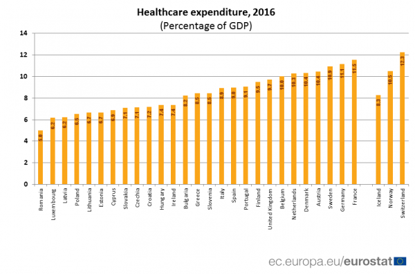 Πόρους που ισοδυναμούν με το 8,5% του ΑΕΠ της δαπανά η Ελλάδα για τη δημόσια υγεία, σύμφωνα με στοιχεία της Eurostat, με βάσει δεδομένων του 2016, πράγμα που την τοποθετεί κοντά στο επίπεδο μαζί με τις ανατολικοευρωπαϊκές και βαλκανικές χώρες.