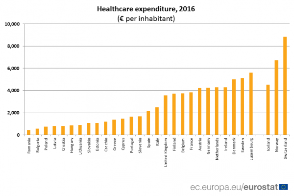 Στην άλλη άκρη του φάσματος βρίσκεται το Λουξεμβούργο, που ξοδεύει 5.600 ευρώ ανά κάτοικο, αν και αυτό ισοδυναμεί μόλις με το 6,2% του ΑΕΠ του. Η Σουηδία δαπανά 5.100 ευρώ κατά κεφαλήν, δηλαδή σχεδόν το 11% του ΑΕΠ της, για την περίθαλψη των πολιτών της.