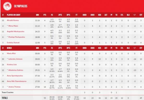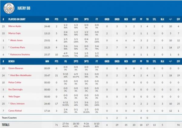 Η ομάδα του Γιώργου Παντελάκη τα βρήκε σκούρα απέναντι στην πολύ καλή άμυνα των γηπεδούχων και μόνο η Τζέσικα Τόμας είχε διψήφιο αριθμό πόντων, με την Αμερικανίδα να ολοκληρώνει το ματς με 14. Αντίθετα, η προπονήτρια της Χατάι είδε τρεις παίκτριές της να σκοράρουν πάνω από 10. Συγκεκριμένα, πρώτη σκόρερ για τις νικήτριες ήταν η Χιντ Μπεν Αμπντελκαντέρ με 21 πόντους, ενώ από κοντά ακολούθησαν οι Γκλόρι Τζόνσον και Κατσιαρίνα Σνιτσίνα με 17 και 10 πόντους αντίστοιχα.