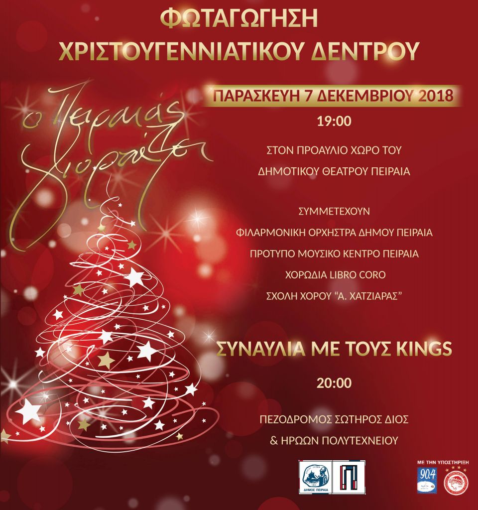 Ο Δήμαρχος Πειραιά κ. Γιάννης Μώραλης θα φωταγωγήσει το Χριστουγεννιάτικο δέντρο του Δήμου Πειραιά, σε μια ξεχωριστή εκδήλωση στον προαύλιο χώρο του Δημοτικού Θεάτρου Πειραιά, την Παρασκευή 7 Δεκεμβρίου 2018, στις 19:00, δίνοντας το έναυσμα για την έναρξη των Χριστουγεννιάτικων εκδηλώσεων στον Πειραιά. Συμμετέχει η Φιλαρμονική Ορχήστρα Πνευστών του Δήμου Πειραιά, το Πρότυπο Μουσικό Κέντρο Πειραιά, η χορωδία Libro Coro και η Σχολή Χορού «Α. Χατζιάρας».