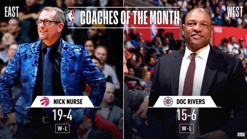 Άκρως εντυπωσιακοί ήταν τον προηγούμενο μήνα, τόσο οι Ράπτορς, όσο και οι Κλίπερς, με την αγωνιστική τους εικόνα να επιβραβεύεται. Πιο συγκεκριμένα, το Τορόντο μέτρησε 19 νίκες και 4 ήττες, ενώ η ομάδα του Λος Άντζελες είχε ρεκόρ 15-6. Αυτό είχε σαν αποτέλεσμα το βραβείο του προπονητή του μηνά Νοεμβρίου σε Ανατολή και Δύση να πάει σε Νικ Νερς και Ντοκ Ρίβερς αντίστοιχα.
