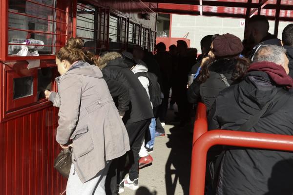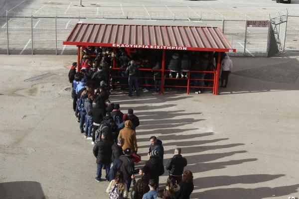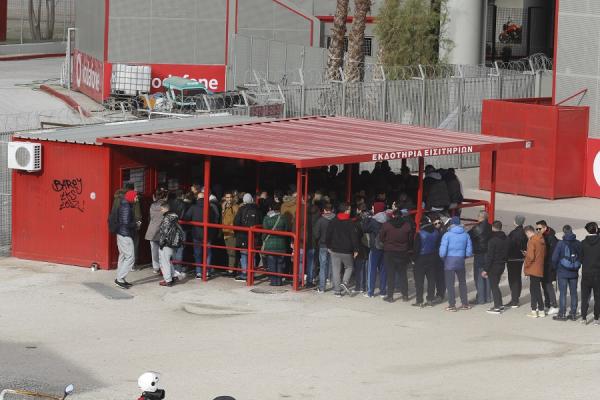 Χαμός στα εκδοτήρια έξω από το Καραϊσκάκη, με τους φίλους του Ολυμπιακού να σχηματίζουν τεράστιες ουρές για ένα εισιτήριο ενόψει του «τελικού» με τη Μίλαν