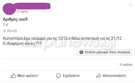 Ετσι, μέχρι και… αγγελία χρειάστηκε να ανεβεί στο facebook για να γίνουν ανταλλαγές μεταξύ των Χανιωτών που έχουν πάρει νούμερο και προσπαθούν να το ανταλλάξουν με κάποιο που τους βολεύει.