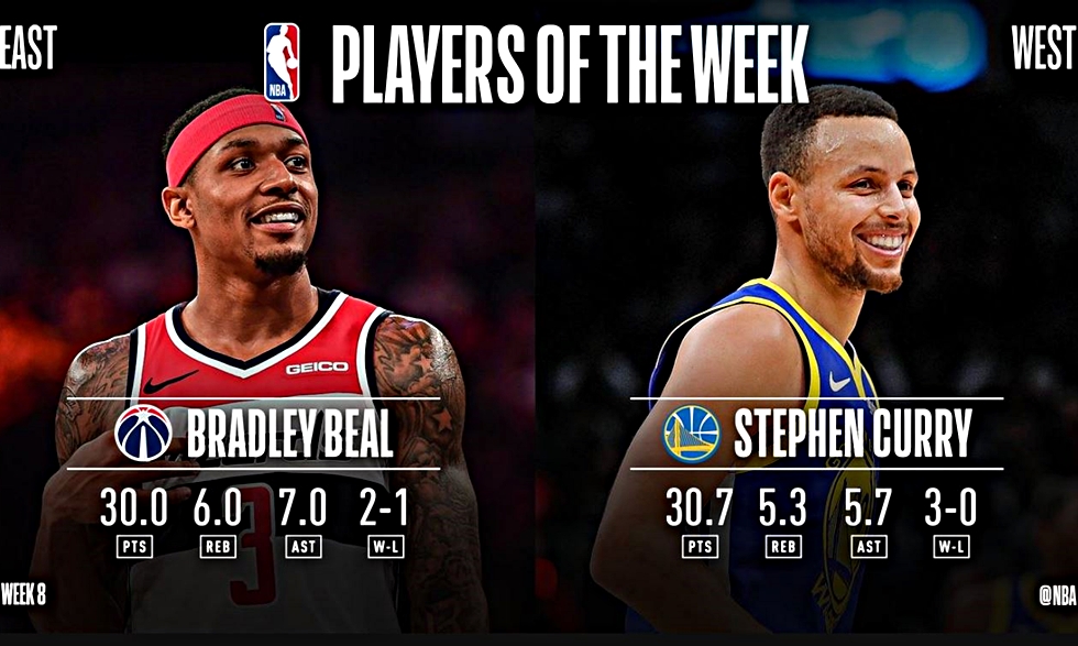 The #NBA Players of the Week for Week 8!@RealDealBeal23 of the @WashWizards (East)@StephenCurry30 of the @warriors (West) pic.twitter.com/F0HRKRwHsc
