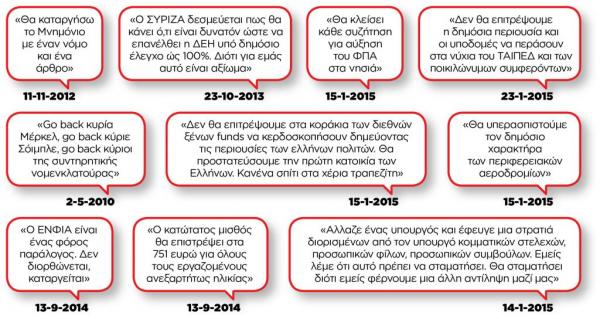 Μία αναδρομή στο πρόσφατο παρελθόν και σε μία σειρά δηλώσεων του πρωθυπουργού για θέματα που άπτονται κυρίως της οικονομίας, αρκεί για να φανεί πως άλλα έλεγε για διάφορα ζητήματα - τόσο προεκλογικά όσο και μετεκλογικά - και άλλα έκανε στην πράξη