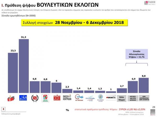 Προβάδισμα 8 μονάδων της ΝΔ έναντι του ΣΥΡΙΖΑ στην πρόθεση ψήψου καταγράφει δημοσκόπηση της MRB. Η Νέα Δημοκρατία συγκεντρώνει ποσοστό 31,3%, ενώ ο ΣΥΡΙΖΑ 23,3%.