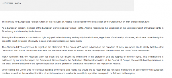 Το Αλβανικό ΥΠΕΞ δηλώνει «έκπληκτο» από τις δηλώσεις του ελληνικού ΥΠΕΞ ενώ τόνισε ότι «λυπάται για τη δήλωση του η οποία στηρίζεται σε διαστρέβλωση των γεγονότων» και ότι η απόφαση για τις απαλλοτριώσεις είναι απόλυτα νόμιμη.