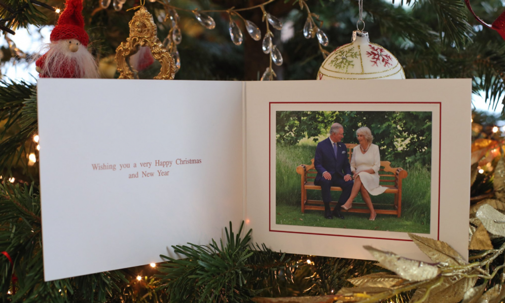 Ο πρίγκιπας Κάρολος και η Καμίλα έκαναν μια πιο εορταστική επιλογή, με μια κάρτα σε χριστουγεννιάτικο δέντρο που τους δείχνει να κάθονται σε ένα παγκάκι στον κήπο του Κλάρενς Χάους και να κοιτάζονται με αγάπη.