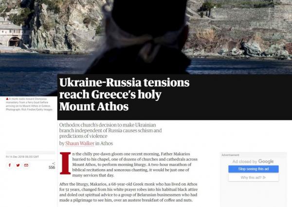 Διχασμένη εμφανίζεται και η μοναστική κοινότητα του Αγίου Όρους από την απόφαση του Οικουμενικού Πατριαρχείου Κωνσταντινουπόλεως να αναγνωρίσει την αυτοκεφαλία της Ουκρανικής Εκκλησίας, όπως αναφέρει σε ανταπόκρισή της η βρετανική εφημερίδα Guardian.