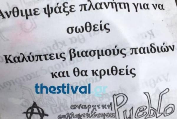 «Άνθιμε ψάξε πλανήτη για να σωθείς! Καλύπτεις βιασμούς παιδιών και θα κριθείς» αναφέρουν τα τρικάκια που πέταξαν.