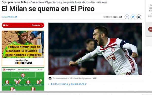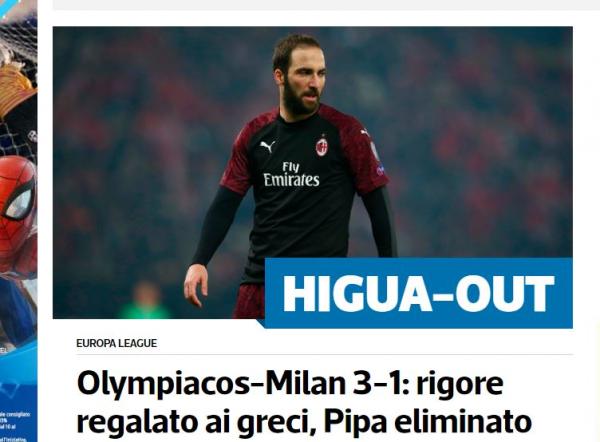 Η μεγάλη ιταλική εφημερίδα Gazzetta στην ηλεκτρονική της έκδοση έχει τίτλο:«Πατατράκ για τη Μίλαν: Αντίο Europa. Αποκλεισμός από τον Ολυμπιακό» και πρόσθέτει: «Οι ροσονέρι έχασαν την πρόκριση στο τελευταίο τρελό ημίωρο, διάστημα στο οποίο δέχθηκαν τρία γκολ. Το γκολ του Ζαπάτα δεν ήταν αρκετό»
