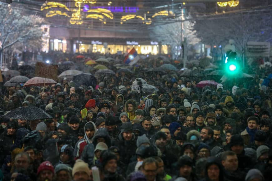 Οι διαδηλωτές έκαναν πορεία στο κέντρο της πόλης, πριν συγκεντρωθούν μπροστά στα γραφεία της προεδρίας της χώρας και του δημόσιου ραδιοτηλεοπτικού δικτύου RTS, ανέφερε ο ειδησεογραφικός ιστότοπος danas.rs. Το περασμένο Σάββατο είχε επίσης γίνει διαδήλωση σε ένδειξη διαμαρτυρίας για τη βία εναντίον των επικριτών της κυβέρνησης, μετά την επίθεση με θύμα έναν ηγέτη της αντιπολίτευσης, τον