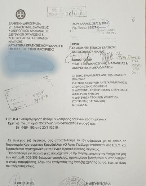Οι γιατροί του νοσοκομείου Νίκαιας αντιδρούν σε έγγραφο των φυλακών Κορυδαλλού