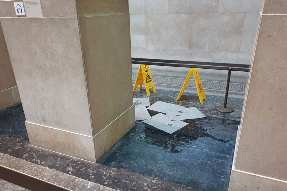 Οι υπεύθυνοι του Βρετανικού Μουσείου τοποθέτησαν χαρτιά, δοχεία και πλαστικές πινακίδες, που προειδοποιούν για την ολισθηρότητα του πατώματος στην αίθουσα Duveen