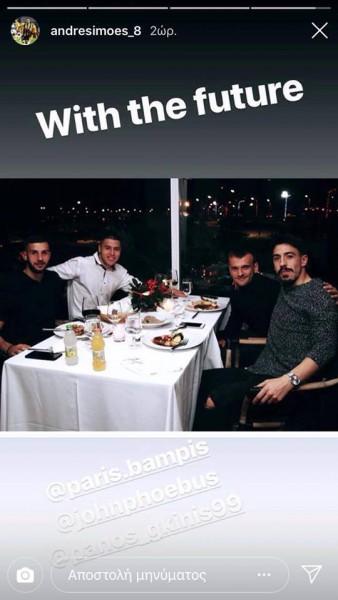 Μάλιστα, ανάρτησε μία φωτογραφία από το εστιατόριο-μπαρ «Ark» της Γλυφάδας, στον προσωπικό του λογαριασμό στο Instagram στην οποία καθόταν παρέα με το νέο… αίμα της ομάδας, τους Φοίβο Μπότο, Παναγιώτη Γκίνη και Πάρη Μπάμπη.