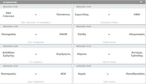 Στις 8/1 ορίστηκε το παιχνίδι του Ολυμπιακού με την Ξάνθη στην ακριτική πόλη, ενώ την ίδια μέρα θα διεξαχθεί και το Παναχαϊκή - ΠΑΟΚ – Έπονται την Τετάρτη 9/1 το ΑΟ Χανιά Κισσαμικός – ΑΕΚ και την Πέμπτη 10/1 το Λαμία - Παναθηναϊκός