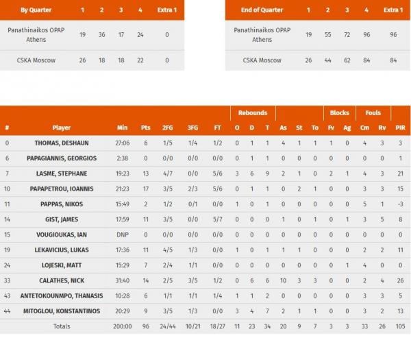 Από τον Παναθηναϊκό οι Παπαπέτρου (17π, 9ρ), ΛΚαλάθης (14π, 10ας), Λάσμε (13π. 9ρ) και Μήτογλου (9π., 7ρ) ήταν οι καλύτεροι, ενώ για την ΤΣΣΚΑ οι Κλάϊμπερν (24π., 10ρ), Ντε Κολό (17π.) και Χίγκινς (12π.) προσπάθησαν.