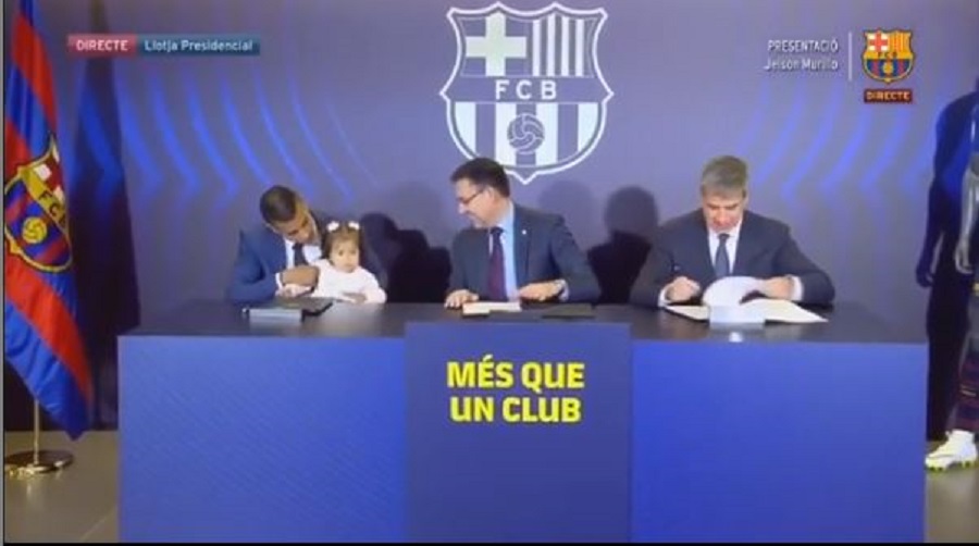 Ο 26χρονος αμυντικός «μετακόμισε» στη Βαρκελώνη για λογαριασμό των Μπλαουγκράνα με τη μορφή δανεισμού από τη Βαλένθια (και οψιόν αγοράς 25 εκατομμύρια ευρώ). Το μεσημέρι της Πέμπτης (27/12) ο Μουρίγιο υπέγραψε το συμβόλαιό του και εν συνεχεία παρουσιάστηκε από τους ανθρώπους της ομάδας. Αυτή που έκλεψε την παράσταση ωστόσο ήταν η μικρή κορούλα του, η οποία έκανε την εμφάνισή της την στιγμή που ο Κολομβιανός σέντερ μπακ υπέγραφε το νέο του συμβόλαιο, πήρε στα χεράκια της το στυλό και έβαλε κι εκείνη την υπογραφή της!