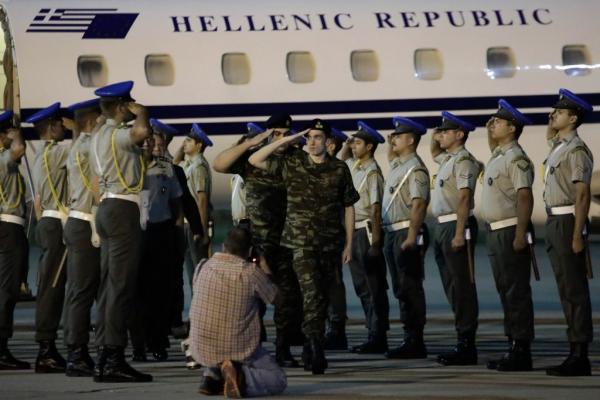 Άφιξη και υποδοχή στο Διεθνές Αεροδρόμιο Μακεδονία, των δύο Ελλήνων στρατιωτικών Άγγελου Μητρετώδη και Δημήτρη Κούκλατζη, οι οποίοι αφέθηκαν ελεύθεροι από τις φυλακές της Ανδριανούπολης όπου κρατούνταν από την 1η Μαρτίου, στην Θεσσαλονίκη, στις 15 Αυγούστου, 2018.