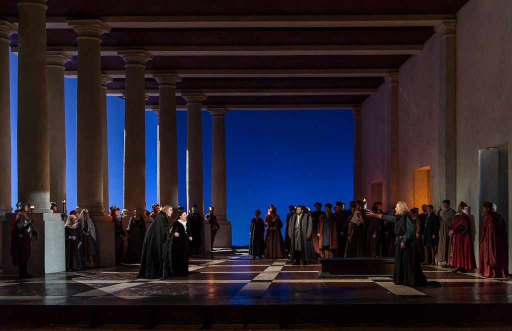 Στην εντυπωσιακή παραγωγή της Βασιλικής Όπερας του Λονδίνου, η οποία παρουσιάζεται για πρώτη φορά στην Ελλάδα στο πλαίσιο της συνεργασίας της ΕΛΣ με το Κόβεντ Γκάρντεν, ο διακεκριμένος σκηνοθέτης της όπερας Ελάιτζα Μοσίνσκυ επιχειρεί μια ιστορική σκηνοθεσία που εμπνέεται από την τέχνη και την αρχιτεκτονική της Αναγέννησης. Το λάιτ μοτίφ της σκηνοθεσίας του είναι οι εικόνες της θάλασσας, οι οποίες επανέρχονται διαρκώς, ως μια αναφορά στη θνητότητα. Για το ανέβασμα της παραγωγής το 2013 στο Λονδίνο, οι Times έγραψαν ότι «αποτελεί τον καλύτερο φόρο τιμής για την επέτειο των 200 ετών από τη γέννηση του Βέρντι». Η παραγωγή παρουσιάστηκε ξανά στο Λονδίνο το φθινόπωρο του 2018, αποσπώντας θετικότατα σχόλια. «Εκπληκτική παραγωγή» την χαρακτήρισε ο Guardian, ενώ η Telegraph έγραψε ότι είναι μια παραγωγή «που θα σύστηνε θερμά στο παραδοσιακό κοινό της όπερας».