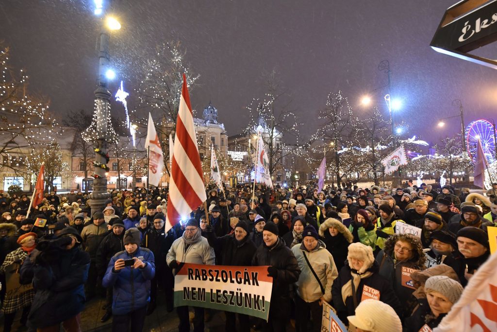 Αψηφώντας το τσουχτερό κρύο, οι διαδηλωτές συγκεντρώθηκαν μπροστά από το κοινοβούλιο της χώρας στις όχθες του Δούναβη, φωνάζοντας συνθήματα όπως «Δεν θα γίνουμε σκλάβοι» και «Βρώμικο Fidesz», το κόμμα του πρωθυπουργού Όρμπαν.