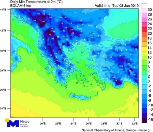 Παγετός, κατά τόπους ισχυρός, θα σημειωθεί στα κεντρικά και βόρεια ηπειρωτικά, όπου τοπικά στα βόρεια ηπειρωτικά θα είναι ολικός, με αρνητικές θερμοκρασίες ολόκληρη την ημέρα – τόσο τη Δευτέρα, όσο και τις πρωινές ώρες της Τρίτης.