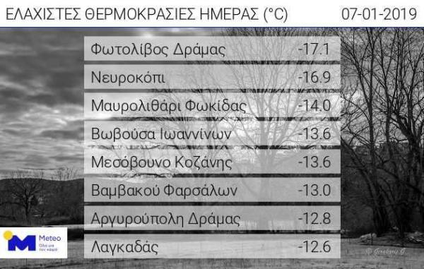 Η θερμοκρασία στη Δυτική Μακεδονία θα κυμανθεί από -16 έως -4 βαθμούς, στα υπόλοιπα βόρεια ηπειρωτικά από -9 έως 1 βαθμό, στα κεντρικά από -8 έως 5, στα νότια από -4 έως 9, στα νησιά του Ιονίου από -2 έως 7, στα νησιά του Βορείου Αιγαίου από 0 έως 4, στα νησιά του υπολοίπου Αιγαίου από 4 έως 8, και στη Κρήτη από 3 έως 7 βαθμούς.