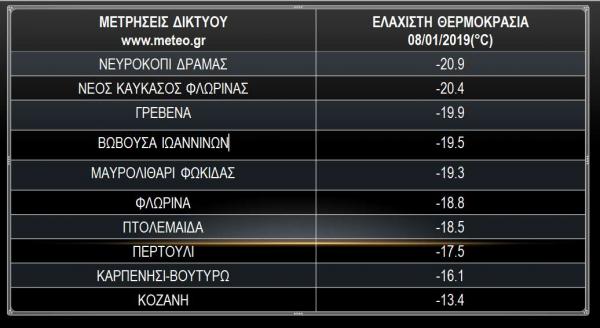 Ακολούθησαν, σύμφωνα με τα στοιχεία του πανελλαδικού δικτύου σταθμών meteo-ΕΑΑ, σε αρνητικές θερμοκρασίες ο Νέος Καύκασος Φλώρινας (-20,4), τα Γρεβενά (-19,9), η Βωβούσα Ιωαννίνων (-19,5), το Μαυρολιθάρι Φωκίδας (-19,3), η Φλώρινα (-18,8), η Πτολεμαΐδα (-18,5) και το Περτούλι (-17,5).