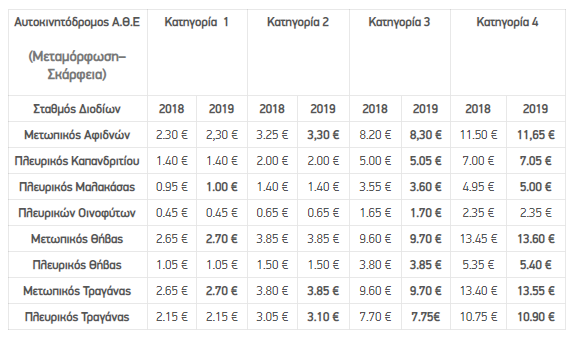 Όσον αφορά την Αθηνών – Λαμίας, οι τιμές των διοδίων σύμφωνα ετήσια τιμαριθμική προσαρμογή διαμορφώνονται ως εξής: