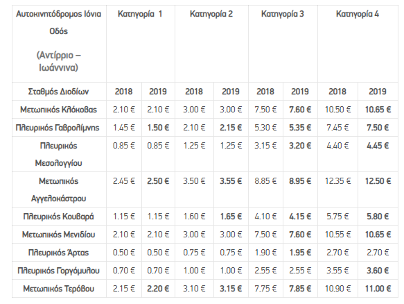 Αναλυτικά οι τιμές όλων των διοδίων ανά σταθμό και κατηγορία οχήματος διαμορφώνονται ως εξής: