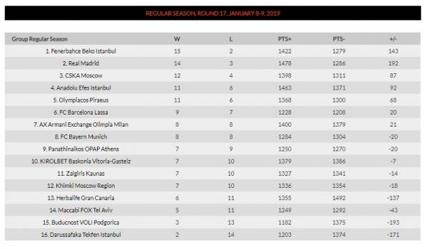 Τέλος, στο ματς που έριξε την αυλαία της πρώτης ημέρας της 17ης αγωνιστικής, η Ρεάλ τα βρήκε σκούρα όπως όλες σχεδόν οι πρωτοπόρες σήμερα, αλλά το τελικό υπέρ της 75-67 ήταν και η 14η νίκη της σεζόν στη Λίγκα, πλησιάζοντας σε μια νίκη απόσταση (14-3) από τη κορυφή και τη Φενέρμπαχτσε (15-2).