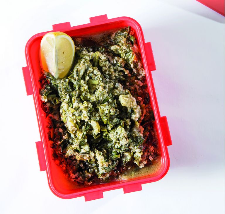 100 ml ελαιόλαδο 5 φρέσκα κρεμμυδάκια, ψιλοκομμένα 1 ξερό μικρό κρεμμύδι, ψιλοκομμένο 1 πράσο, το λευκό μέρος, ψιλοκομμένο 1/2 φινόκιο, ψιλοκομμένο 1 κιλό σπανάκι, πλυμένο, καθαρισμένο και χοντροκομμένο 180 γρ. κινόα, πλυμένη κάτω από τρεχούμενο νερό και σουρωμένη 150 ml νερό 1/2 ματσάκι άνηθο, ψιλοκομμένο 1/2 ματσάκι μάραθο, ψιλοκομμένο 50 ml χυμός λεμονιού Αλάτι και φρεσκοτριμμένο πιπέρι