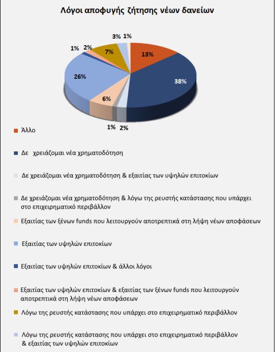 «Θέλοντας να εμβαθύνουμε, στους λόγους που οι ελεύθεροι επαγγελματίες και οι επιχειρήσεις αρνούνται να αιτηθούν νέα χρηματοδότηση από το πιστωτικό σύστημα, καταλήξαμε στο συμπέρασμα ότι το 32% των ερωτηθέντων αρνούνται να αιτηθούν νέα δάνεια λόγω του υψηλού επιτοκίου αλλά και των ξένων Funds» αναφέρεται στη μελέτη.