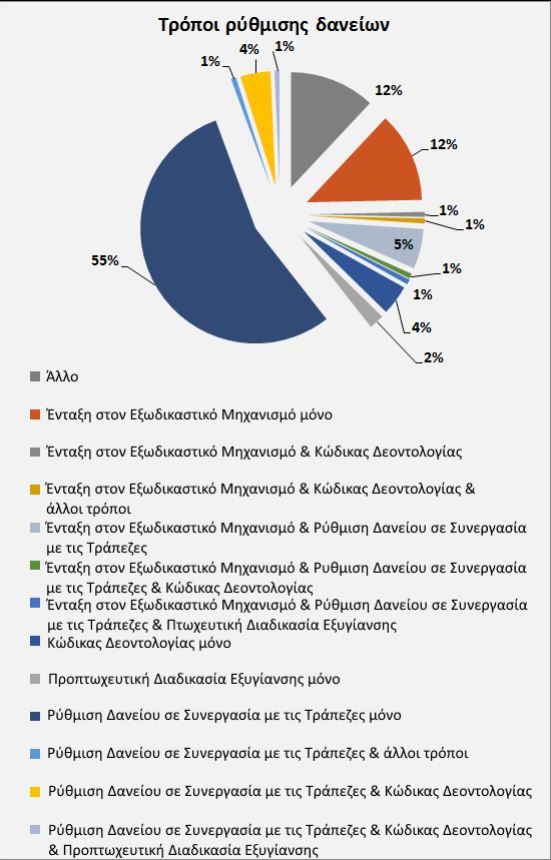 Εξ αυτών, το 12% επιθυμεί λύση μέσω του εξωδικαστικού μηχανισμού, ενώ το 55% σε συνεργασία με τις τράπεζες.